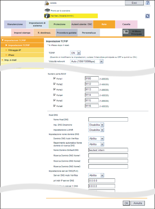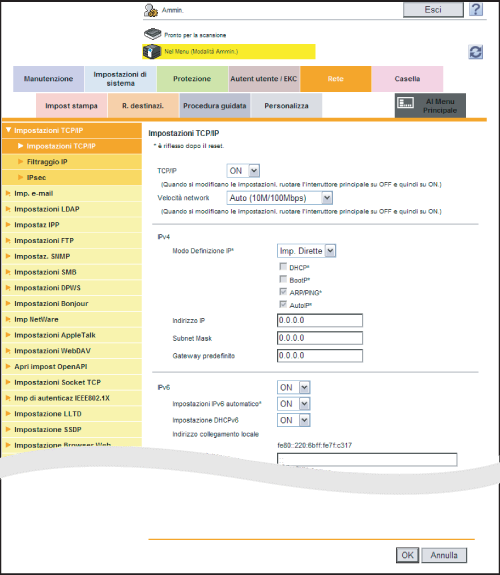 Nel modo amministratore, selezionare [Rete] - [Impostazioni TCP/IP] - [Impostazioni TCP/IP], quindi configurare le seguenti impostazioni.