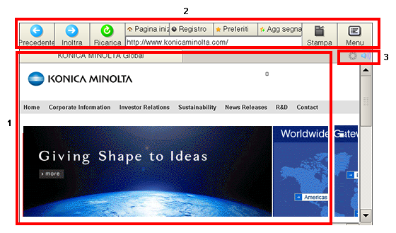 2 | Barra degli strumenti | Un clic su un'icona situata sulla barra degli strumenti sposta e ricarica la pagina, oppure visualizza e aggiunge una pagina dei preferiti. Se si inserisce l'URL nel campo di immissione dell'indirizzo, si può visitare la pagina all'URL specificato. La barra degli strumenti supporta le Impostazioni Browser Web. Per informazioni dettagliate, fare riferimento a Qui. |