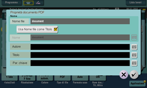 [Nome] | Deselezionare la casella di controllo [Usa Nome file come Titolo] per inserire un titolo di un file PDF (utilizzando fino a 64 caratteri). |