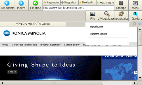 Premere [Menu] - [Impostaz.] sulla barra degli strumenti per eliminare i cookie.