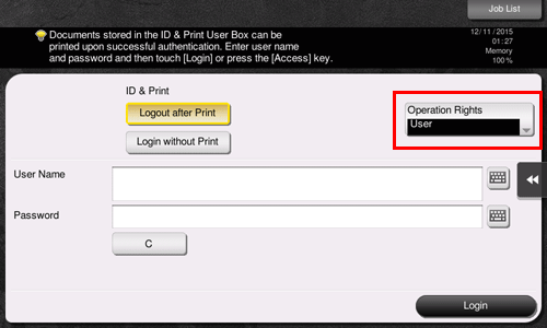If the registered user has administrator privileges or User Box administrator privileges assigned, the user can select operation privileges to log in. The contents of the Login screen may vary depending on the authentication setting of this machine.