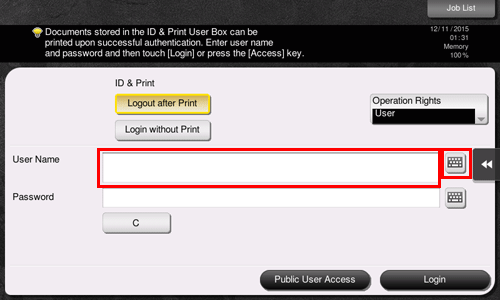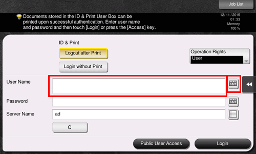 If user authentication and account track are synchronized, account track is not required.If authentication succeeds, you can log in to this machine. The user name is displayed on the top section of the screen during the login process.