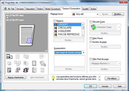 Dans [Superposition] de l'onglet [Tampon/Composition], sélectionnez [Créer image sur serveur] ou [Imprimer image périphérique] (PCL seulement), puis dans la liste, sélectionnez l'image de surimpression à imprimer sur l'original en tant qu'image composite.