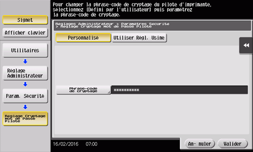 1. Tapez sur [Utilitaire] - [Réglages administrateur] - [Paramètres sécurité] - [Réglage cryptage mot de passe pilote].