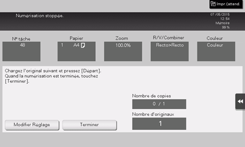 Lorsque la numérisation de tous les originaux est terminée, tapez [Finition] et appuyez sur la touche Départ.
