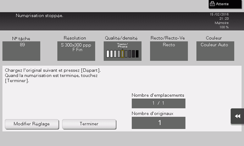 Lorsque la numérisation de tous les originaux est terminée, tapez [Finition] et appuyez sur la touche Départ.