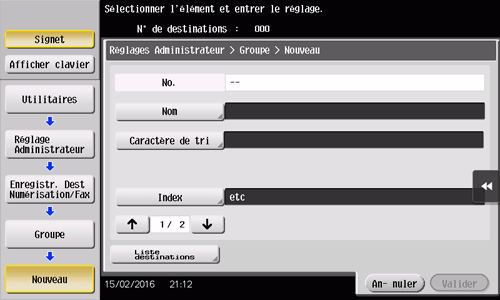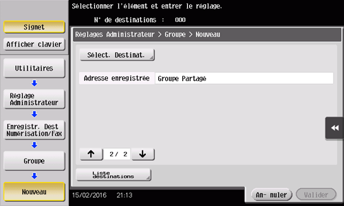 Tapez sur [Utilitaires] - [Enregistrement 1-Touche/Boîte] - [Enregistr. Dest Numérisation/Fax] - [Groupe] - [Nouveau].