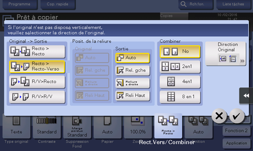 • Pour les originaux recto-verso, sélectionnez [R/V > Recto] ou [R/V > R/V]. Sélectionnez une touche quelconque correspondante à l'état de l'original et au résultat de la copie.