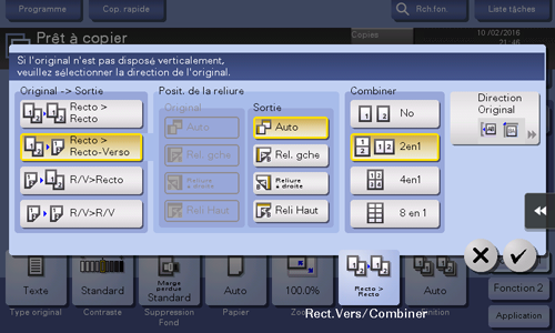 Permet de copier un original recto sur les deux côtés ou un original recto-verso sur les deux ou sur un seul côté.