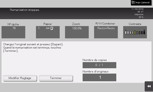 Lorsque la numérisation de tous les originaux est terminée, tapez [Finition] et appuyez sur la touche Départ.