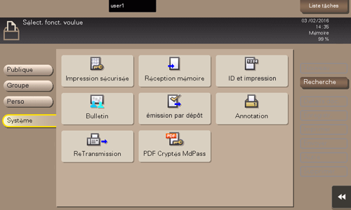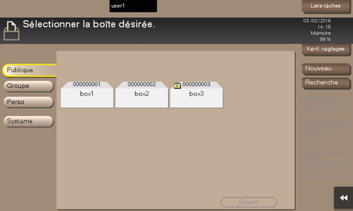 L'utilisateur peut enregistrer des documents dans la boîte utilisateur. De même, il peut imprimer un fichier d'une boîte utilisateur ou envoyer un fichier à un autre utilisateur.