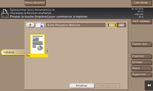 Pour envoyer un fax enregistré dans la boîte réception mémoire, l'option i-Option LK-110 v2 est nécessaire.