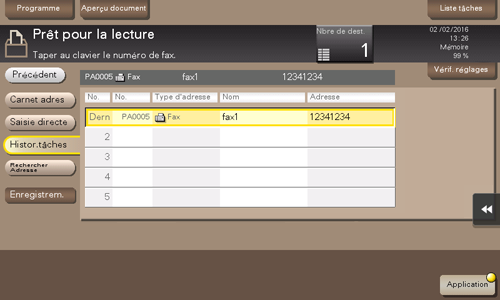 Tapez sur [Histor.tâches], puis sélectionnez une destination depuis l'historique des numérisations ou des fax.