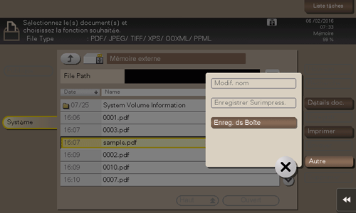 Lorsque vous enregistrez un fichier PDF protégé par un mot de passe, le fichier est archivé dans la boîte PDF Crypté Mot de Passe. Pour enregistrer un fichier dans une boîte utilisateur depuis la Boîte PDF Crypté Mot de passe sélectionnée, voir Ici.