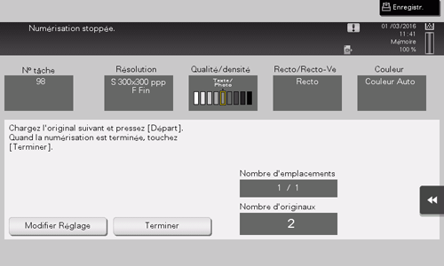 Lorsque la numérisation de tous les originaux est terminée, tapez [Finition] et appuyez sur la touche Départ.