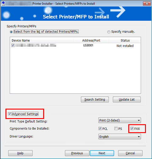 6. Cochez la case [Réglages avancés], puis vérifiez que la case [FAX] est cochée dans [Composants à installer].