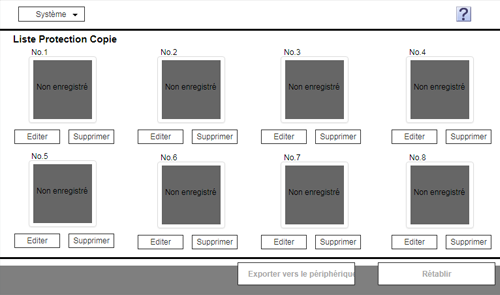 Un clic sur [Supprimer] supprime les données de protection copie enregistrées. Les données de protection copie ne seront pas supprimées tant que vous ne cliquez pas sur [Exporter vers le périphérique] et que vous ne les écrivez pas sur cette machine.