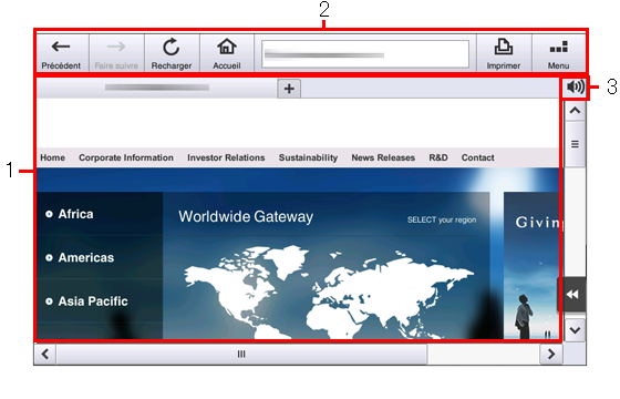 2 | Barre d'outils | En tapant sur une icône de la barre d'outils, vous déplacez et rechargez une page ou affichez et ajoutez un favori. Si vous entrez une adresse URL dans le champ de saisie d'adresse, vous pouvez ainsi visiter directement une page à l'adresse URL spécifiée. La barre d'outils prend en charge les réglages du navigateur Web. Pour des détails sur la barre d'outils, voir Ici. |