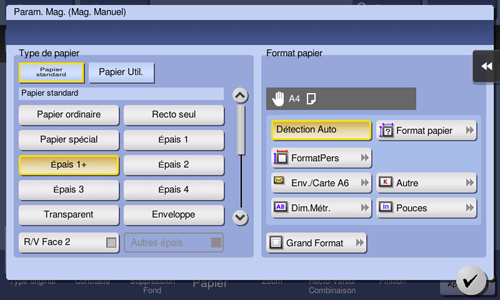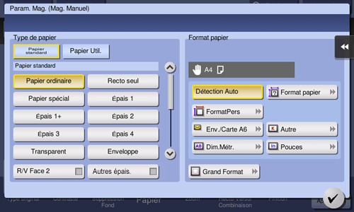 Si vous ne changez pas de type de papier et si vous n'utilisez pas de papier de format personnalisé quand vous ajoutez du papier, vous pouvez utiliser la sélection actuelle sans la modifier.