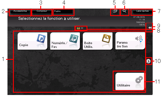 1 | Touches du menu principal | Affiche les touches raccourcis assignées aux fonctions. Les touches de raccourci peuvent être personnalisées selon vos besoins. Par défaut, [Copie], [Numéris./Fax], [Boîte Utilis.] et [Paramètre Son][Carnet d'adresses] et [Utilitaire] figurent dans le menu principal. ([Utilitaire] est fixe.)