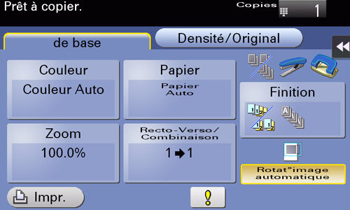 [Copie] | Tapez sur ce bouton pour afficher l'écran principal du mode Copie. Pour des détails, voir Ici. |
