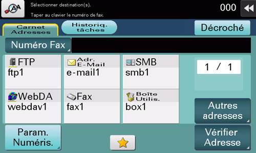 [Fax] | Tapez sur ce bouton pour afficher l'écran principal du mode Fax. Le mode fax propose uniquement les fonctions de fax disponibles en mode numérisation/fax. Ce mode permet de rappeler rapidement la fonction cible en cas d'utilisation d'un fax. Le mode fax présente les caractéristiques suivantes.