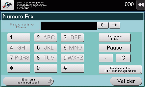 • Effleurez [Entrer le N° Enregistré] vous permet de spécifier une destination avec un numéro enregistré.