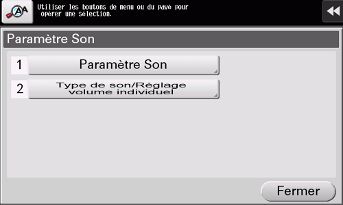 [Type de son/Réglage Volume] | Spécifiez le type et le volume pour chacun des sons suivants : [Son confirmation opération], [Son opération terminée], [Son préparation terminée], [Son alerte], [Son suppression] et [Son d'authentification]. Pour définir tous les types de son et leur volume en une fois, sélectionnez [Sélection lots]. Sélectionnez un type de son parmi les six proposés types et sélectionnez un volume sonore entre [Élevé]/[Moyen] /[Faible] pour le réglage. Pour définir tous les types de son et de volume séparément, sélectionnez [Réglage individuel]. |