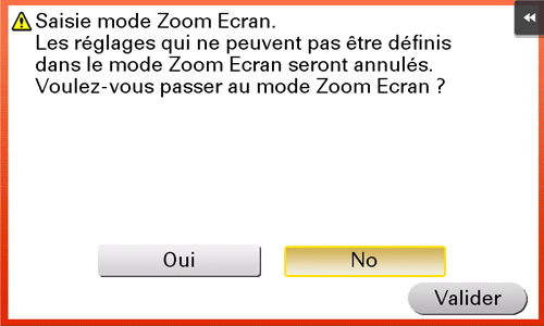 Tapez sur [Zoom Écran] pour passer en Mode Zoom Écran de sorte que le contenu défini et ayant été effectué via l'affichage normal de l'écran, puisse être supprimé. Si nécessaire, vous pouvez afficher l'écran suivant pour vérifier s'il faut annuler les paramètres configurés à l'écran normal et passer au mode Zoom Écran.