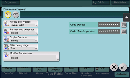 [Cible de cryptage] | Sélectionnez la plage à crypter. La sélection [Autre que métadon.] exclut les informations de propriété du traitement de cryptage. |