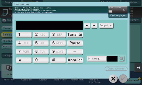 Entrez un numéro de fax de destination lorsque les données de l'original numérisé sont envoyées par fax. En cas de spécification de plusieurs destinations, tapez sur [Dest. suivante] pour ajouter des destinations.