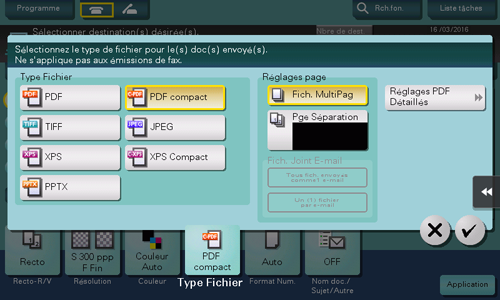 [Réglages PDF détaillés] | Si [PDF] ou [PDF compact] est sélectionné comme format de fichier, vous pouvez configurer les réglages de l'option PDF. Vous pouvez renforcer la sécurité en joignant une signature numérique identifiant l'auteur du fichier, en cryptant le fichier, etc. Pour des détails, voir Ici. |