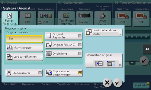 Si vous envoyez un fax ou un fax réseau, la spécification de [Originaux mixtes] est automatique et le réglage [Suppression pages vierges] est annulé.