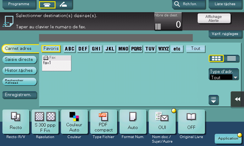 Vous pouvez soit entrer directement une destination de transmission en tapant sur la zone de saisie ou sur l'icône du clavier ou sélectionner l'une des destinations enregistrées dans la machine en tapant sur l'icône de liste.