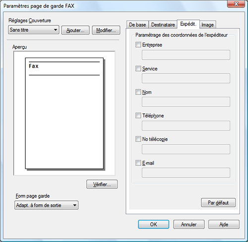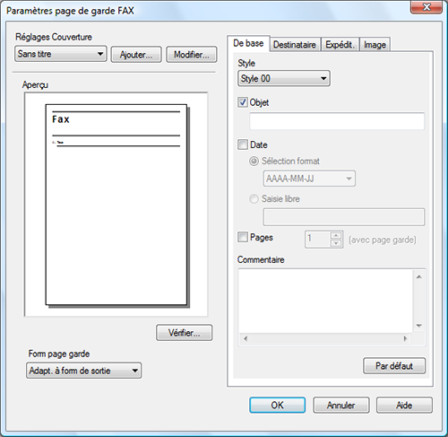 [Pages] | Quand vous ajoutez le nombre total de pages de fax sur la page de garde, cochez cette case et sélectionnez un nombre de pages de fax ; page de garde comprise. |
