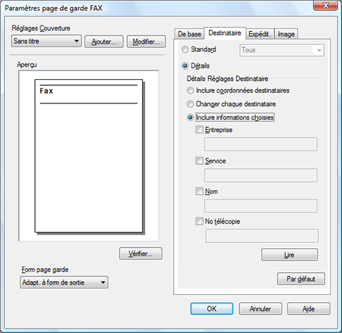[Inclure informations choisies] | Entrez les informations que vous avez définies aux champs [Entreprise], [Service], [Nom] et [No télécopie] (80 caractères max. pour chaque entrée). Vous pouvez sélectionner cette option si un destinataire a été ajouté à la [Liste des destinataires] de l'écran [Fenêtre éclair Envoi FAX].