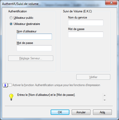 Si Suivi de Volume (E.K.C.) est activé, entrez le nom du compte et le mot de passe.