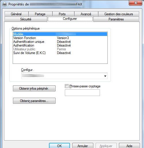 S'ils ne sont pas correctement configurés, sélectionnez [Authentification] ou [Suivi de Volume (E.K.C)] dans la liste, puis changez le réglage approprié dans [Configur.]