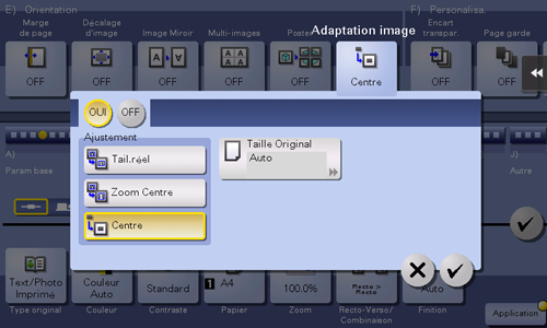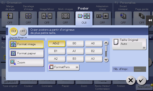 [Nb. d'Impr.] | Si vous sélectionnez une autre option que [Auto] sous [Taille Original], le nombre d'impressions est affiché. |