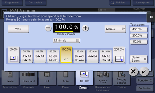 [Auto] | Tapez sur ce bouton pour réaliser automatiquement une copie avec le taux de zoom optimal pour ajuster l'image de l'original au format du papier. C'est utile si vous devez spécifier le taux de zoom. |