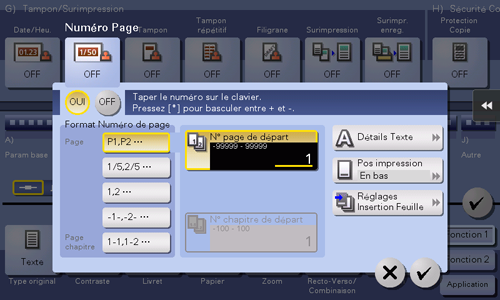 [ON]/[OFF] | Sélectionnez [OUI] pour imprimer des numéros de page. |
