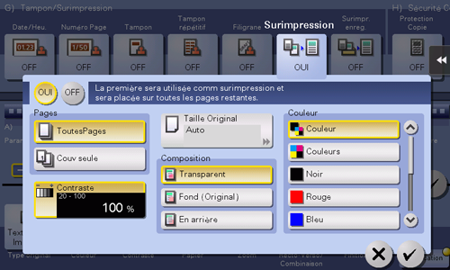 [ON]/[OFF] | Sélectionnez [OUI] pour enregistrer une nouvelle image de surimpression ou composer une image de surimpression enregistrée sur l'original. |