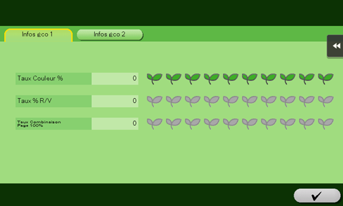 Les informations Éco indiquent le résultat du pourcentage de travaux d'impression couleur dans l'ensemble des travaux d'impression, le pourcentage d'économie de papier en utilisant l'impression recto-verso ou la fonction de combinaison des pages et le temps cumulé d'opérations ou d'économie d'énergie résultant des méthodes d'utilisation. Ces informations vous aideront à comprendre le statut d'exploitation de cette machine.