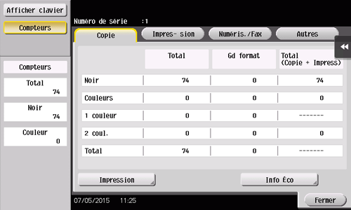 Pour imprimer la liste des compteurs, tapez sur [Impression], sélectionnez le papier, et appuyez ensuite sur la touche Départ.