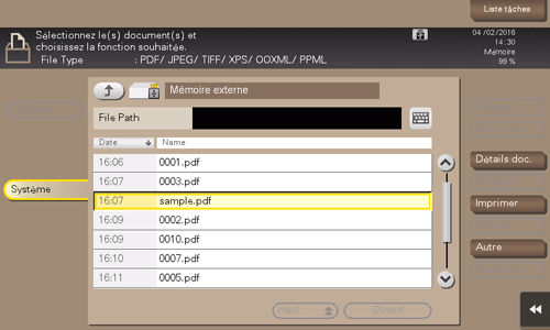 Vous pouvez également imprimer des fichiers en sélectionnant le mode Boîte utilisateur et en tapant sur [Système] - [Mémoire externe].