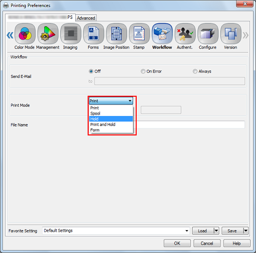Seleccione [Retener] o [Imprimir/Retener] en [Modo de Impresión].