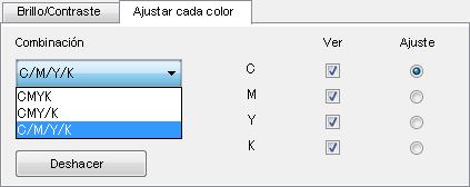 [Combinación] | Permite seleccionar [CMYK], [CMY/K] o [C/M/Y/K]. Si se selecciona [CMYK], puede ajustarse la curva de tono consolidada de CMYK. Si se selecciona [CMY/K], pueden ajustarse la curva de tono consolidada de CMY y la curva de tono de K. Si se selecciona [C/M/Y/K], pueden ajustarse las curvas de tono de cada color de CMYK. |