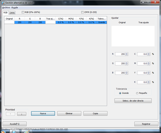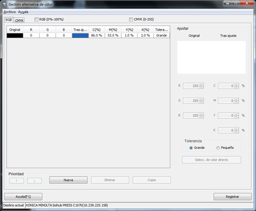 Haga clic en la ficha [RGB] o en la ficha [CMYK] de la pantalla [Gestión alternativa de color].