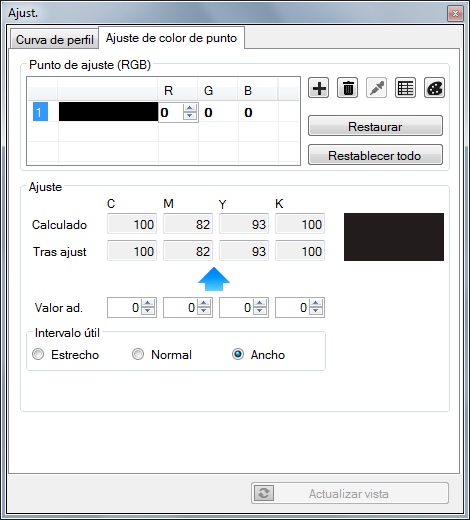 Los valores que se muestran en [Result.] y [Tras ajust] son los valores a los que se aplica la curva de entrada y la tabla de conversión de color. (La curva de salida todavía no se aplica a los valores).