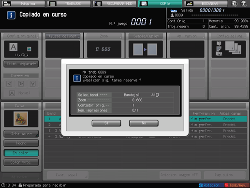 Si pulsa [No], aparece la pantalla seleccionada en [Config. pantalla predet.]. Si pulsa la ficha [COPIA] en ese momento, aparece la pantalla [COPIA] y pueden reservarse trabajos.